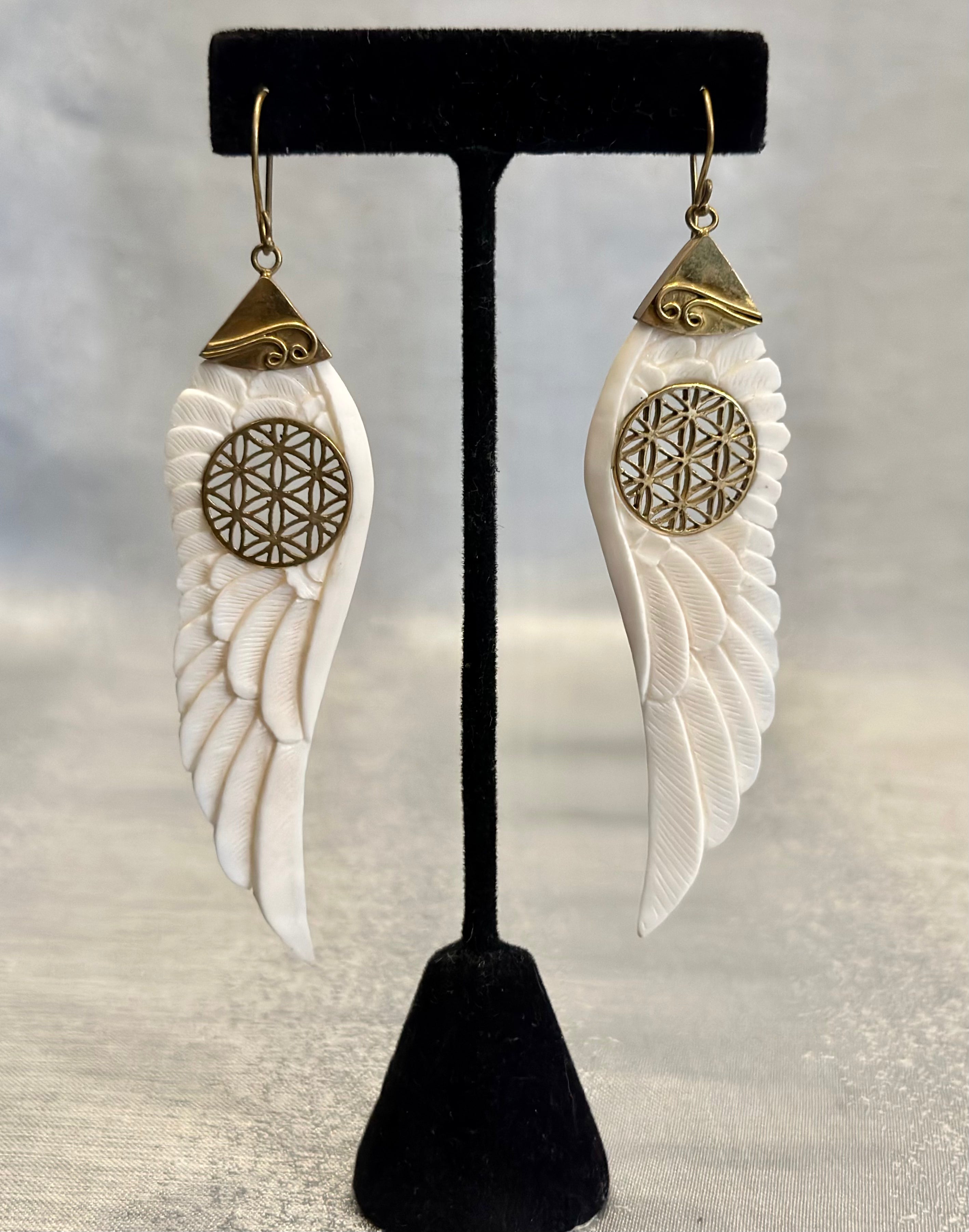Bone earrings wing flower life brass. Earrings are delicately sculpted from bone with brass flower of life...