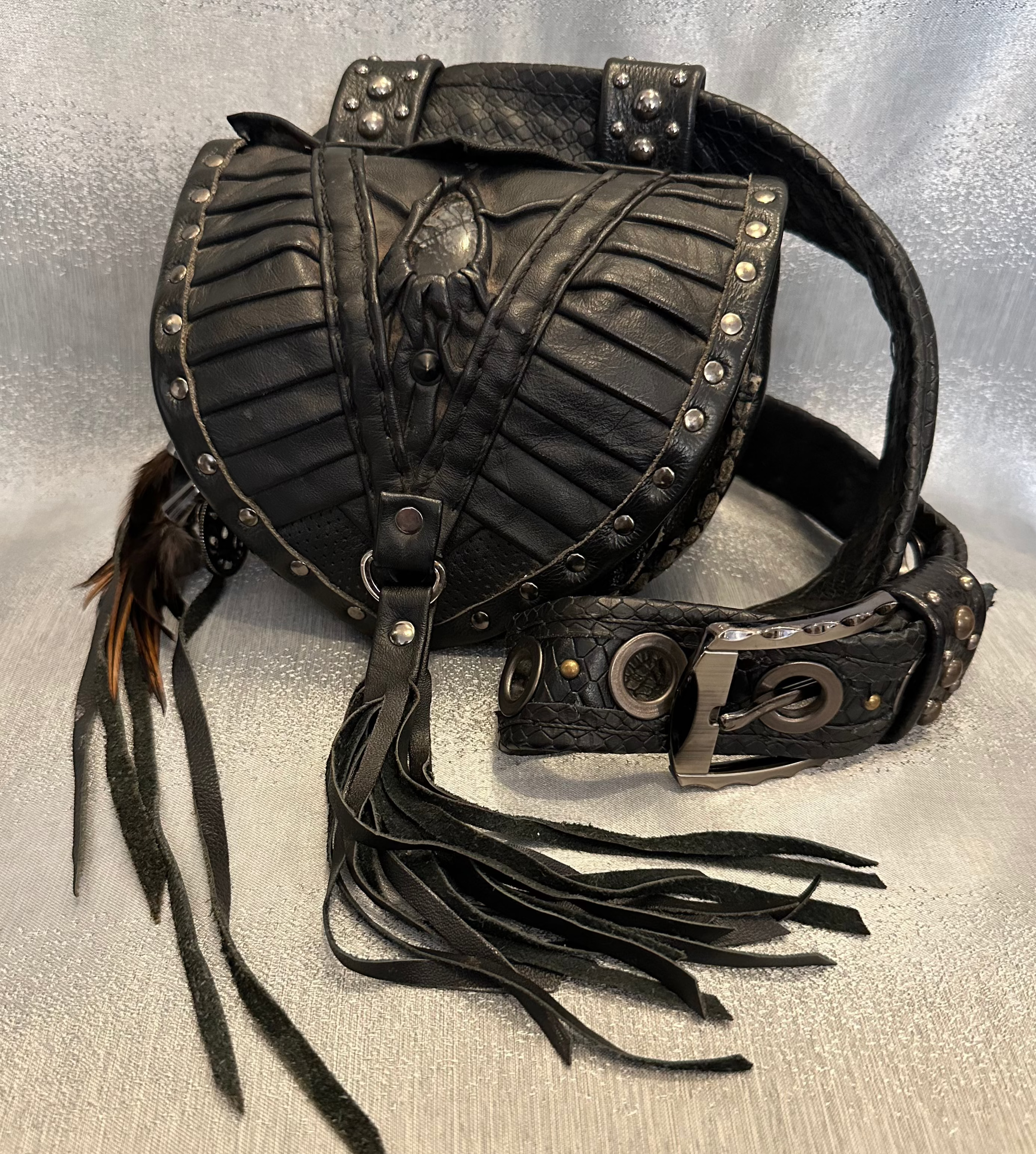 With intricate leather details and hardware this bag comes embedded with an obsidian crystal stone. Large and small secure pockets with zippers adorned with feathers, leather tassels, and steam punk style charms. Small secret back zip pocket for all your hidden treasures.